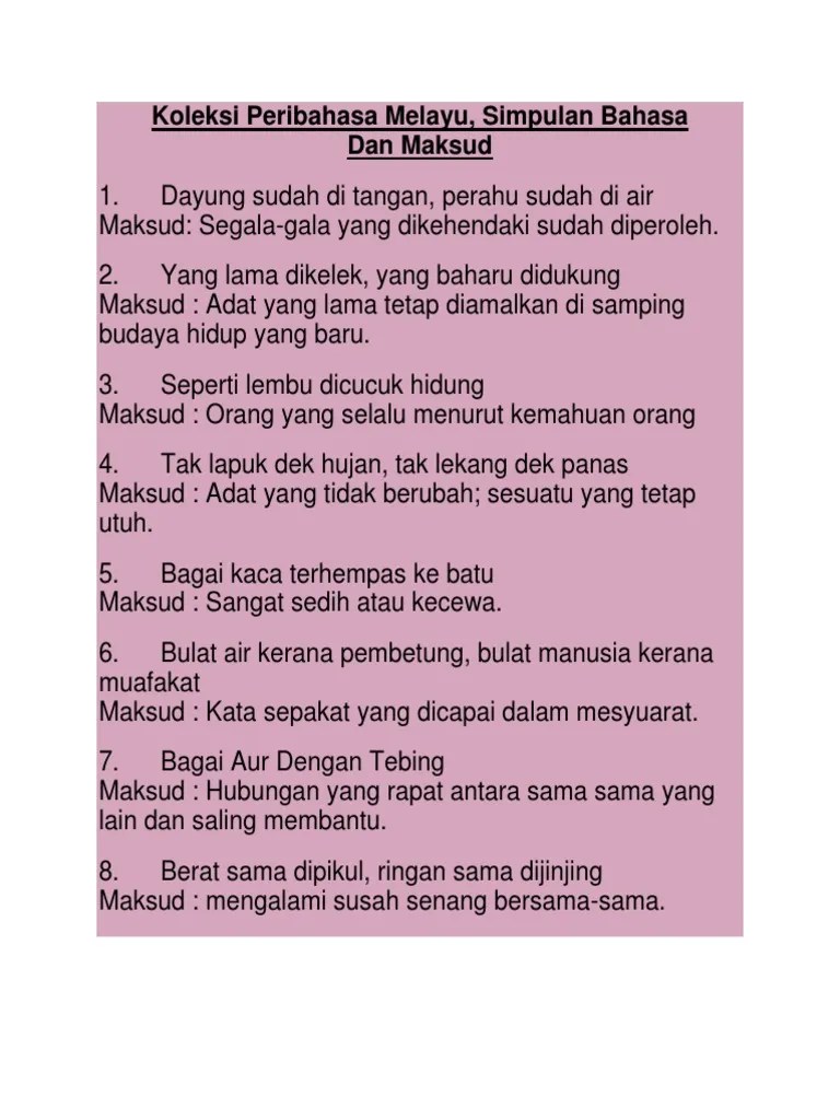 Kata sepakat yang dicapai melalui mesyuarat 24. 199 senarai peribahasa atau kumpulan kata yang tetap susunannya dengan maksud tertentu bertujuan memberi nasihat, pengajaran, teguran, sindiran dan . Peribahasa ialah susunan kata yang pendek dengan makna yang luas, mengandungi kebenaran, sedap didengar dan bijak perkataannya. Enggan seribu daya , mahu sepatah kata erti :